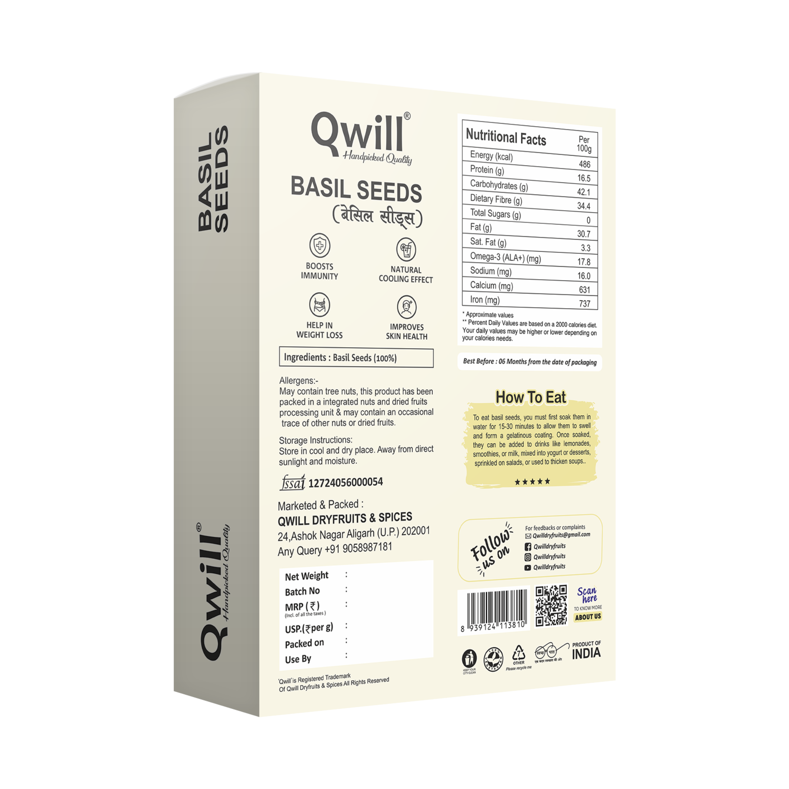 Refresh your wellness routine with Qwill Premium Basil Seeds. Carefully sourced and naturally processed, these tiny seeds are valued for their cooling properties and rich nutritional profile. Known for supporting digestion and hydration, basil seeds are a traditional superfood ideal for everyday consumption.
