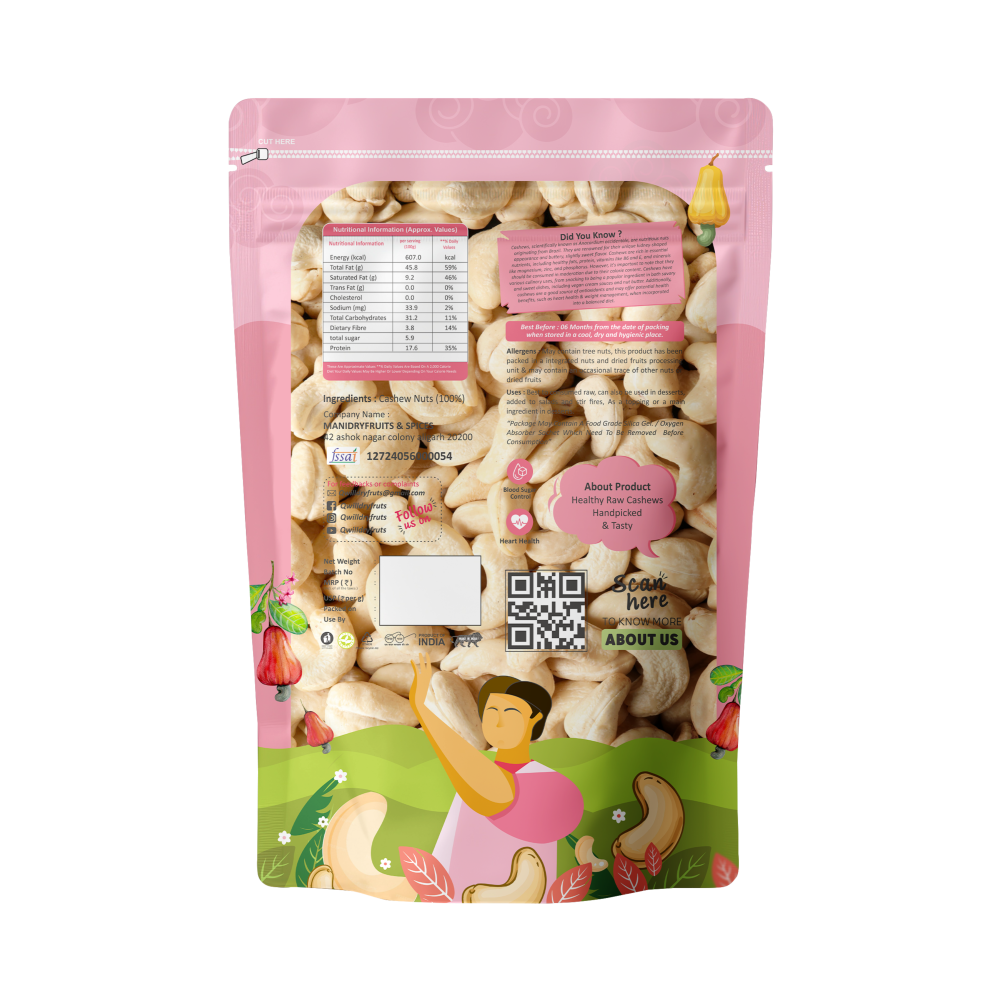 Prepared from 100% pure, high-quality whole cashews, this natural superfood supports heart health, sustained energy, and overall vitality. Enjoy them raw, roasted, lightly salted, or added to curries, sweets, desserts, and baked delicacies—every serving delivers clean, wholesome nutrition.