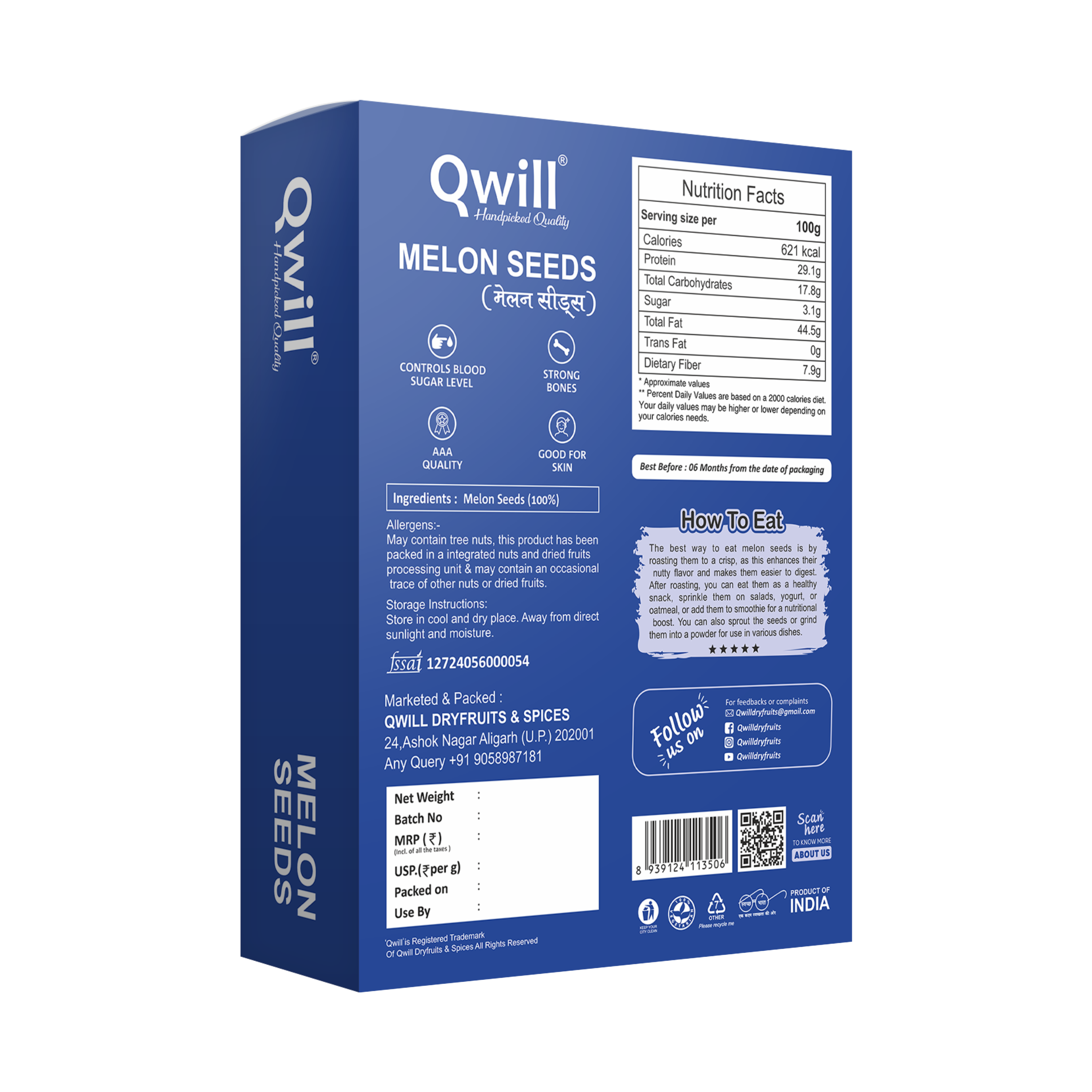 Discover the light, nutty crunch of Qwill Premium Melon Seeds. Carefully sourced and naturally processed, these nutrient-dense seeds are packed with essential vitamins, minerals, and healthy fats that support everyday wellness. Melon seeds are known for their protein-rich profile and energy-supporting properties, making them a wholesome addition to a balanced diet.